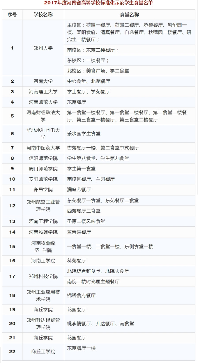根據**組推薦結果,經研究,4月23日,河南省教育廳對2017年度河南省高等學校標準化學生公寓和標準化學生食堂評審結果進行了公示。快看你家學校公寓和食堂入選了沒!